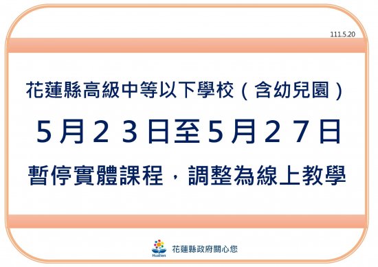 依縣府指示,5月23日至27日全縣高中以下停止實體課程,進行遠距教學。