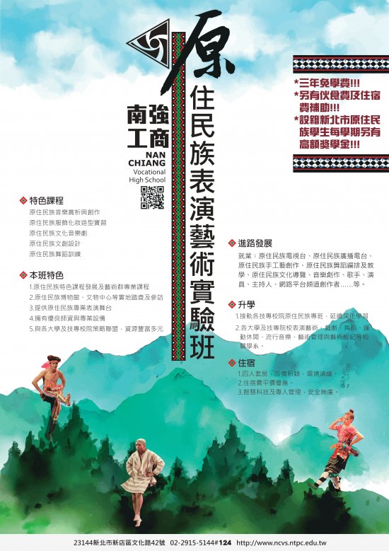 | 一、 | 本專班為協助原住民族學生認識並體驗族群藝術文化、延續並傳承族群藝術化精髓與特色,開設深具原民色彩之課程,如原民舞蹈訓練、原民文創設計等特色課程,培育表演藝術與藝文設計方面專業人才。 |