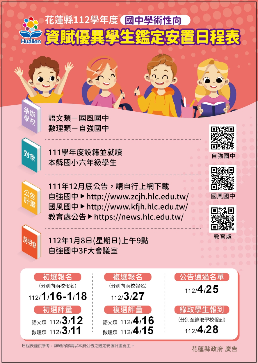 花蓮縣112學年度【國中學術性向】資賦優異學生鑑定安置日程表