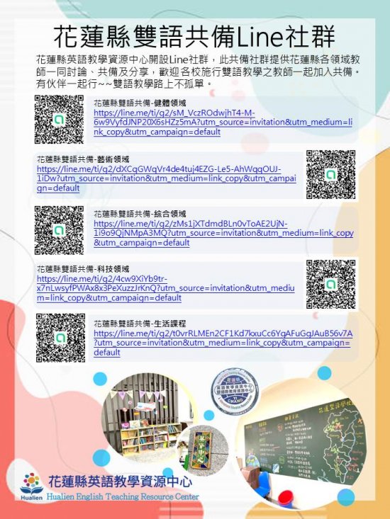 為協助學校推動雙語教學,英語教學資源中心辦理跨校雙語教學共備社群,歡迎各校雙語教師加入,並於群組裡交流討論及分享雙語教學。有意願加入之教師請詳見附件(海報)上Qrcode,加入line群後有專人進行後續社群運作說明及討論。