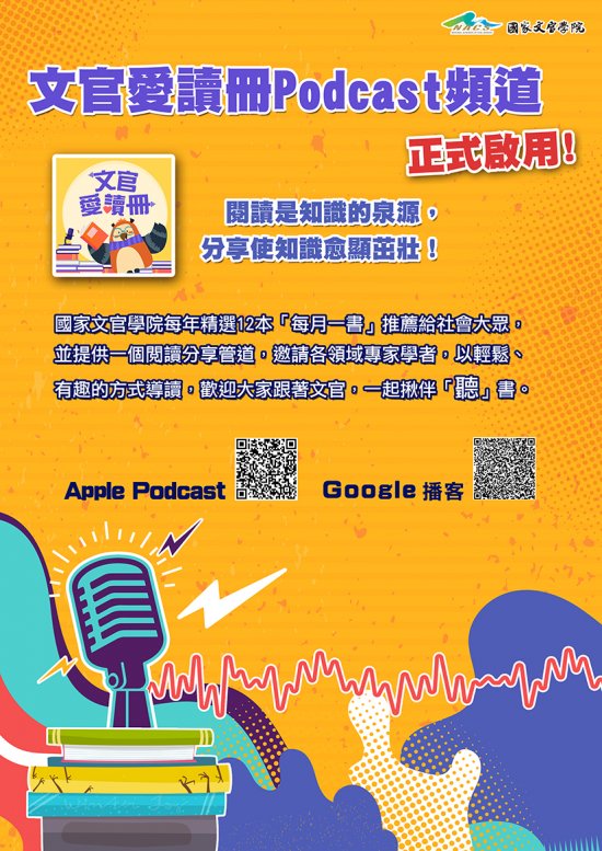 「文官愛讀冊」Podcast頻道已上線閱讀人鄭俊德介紹每月一書《長思短想》、《愛的藝術》、《寫給公民的40堂思辨課》、《地圖會說話》、《人生就是賽局》以及呂育誠教授導讀《長思短想》上、下集等7段節目,歡迎收聽並訂閱追蹤。 |