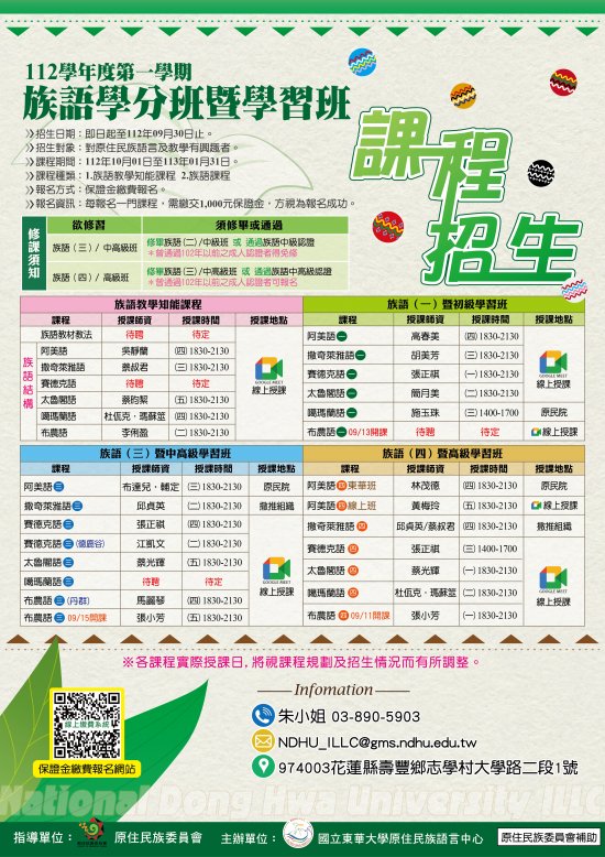 二、「112學年度第一學期原住民族語言學分班暨學習班」課程相關資訊詳見招生海報。