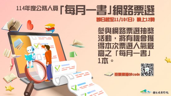 縣府轉知國家文官學院辦理114年度公務人員「每月一書」網路票選活動,請同仁踴躍上網票選優良圖書。