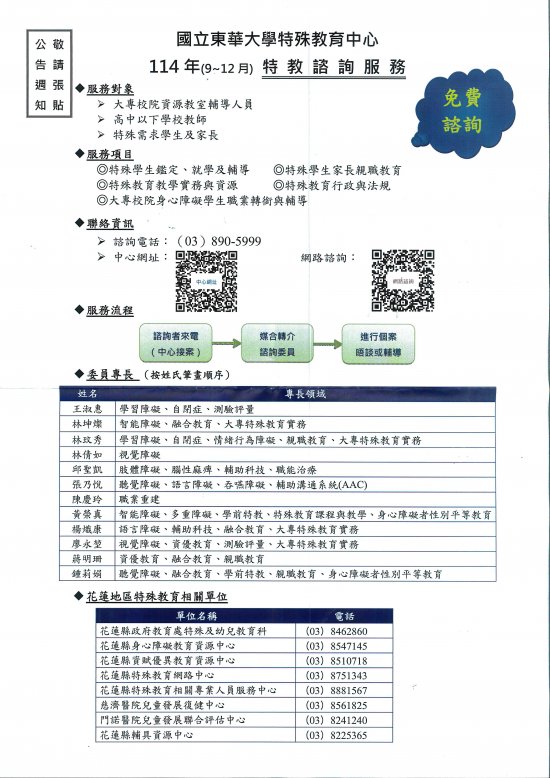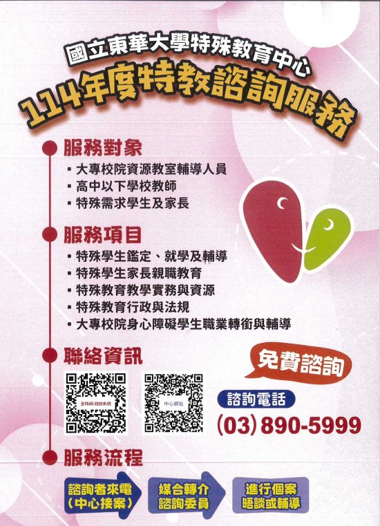 國立東華大學特殊教育中心 114年(9-12月)特教諮詢服務文宣